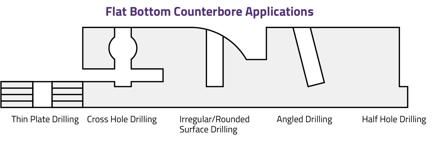 • Flat bottom design (no dish) allows for spot facing or counterboring on irregular surfaces commonly found on rounded or complex parts