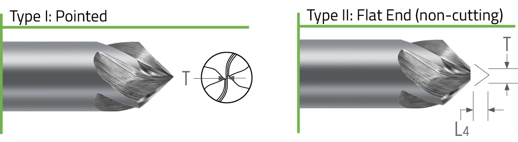 Engineered with a specialized helical flute design for superior performance, this offering of High Performance Chamfer Mills is offered in Type I (Pointed) and Type II (Flat End, non-cutting) styles.