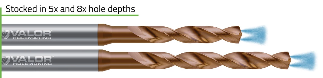 Valor Holemaking's offering of High Performance Drills - Steels - Coolant-Through provides best-in-class performance in 4140 Steel and other alloy steels, and features coolant-through channels for enhanced chip evacuation.