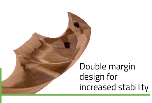 • Engineered double margin geometry provides performance and stability when drilling intersecting holes and/or exiting holes on inclined or irregular surfaces